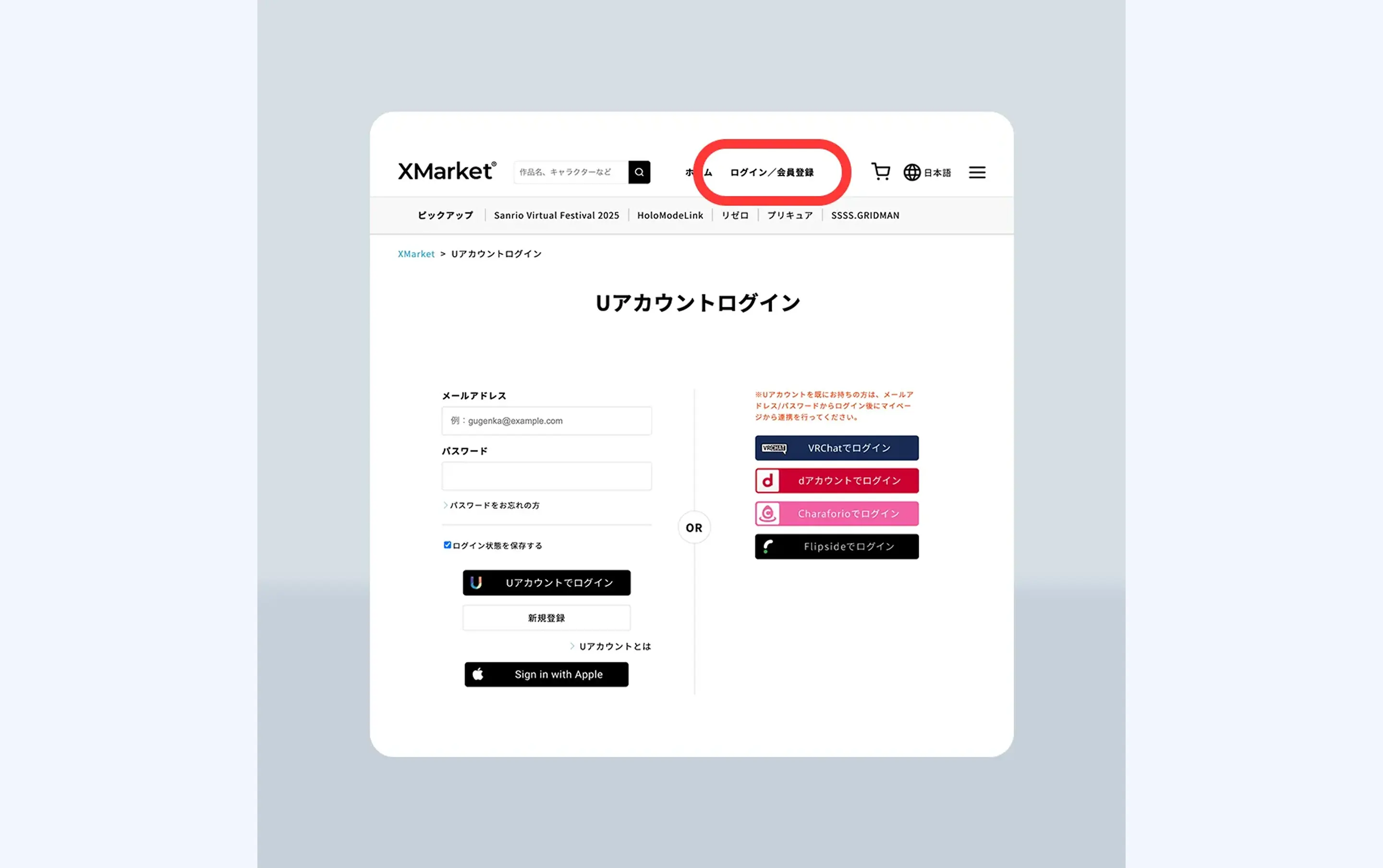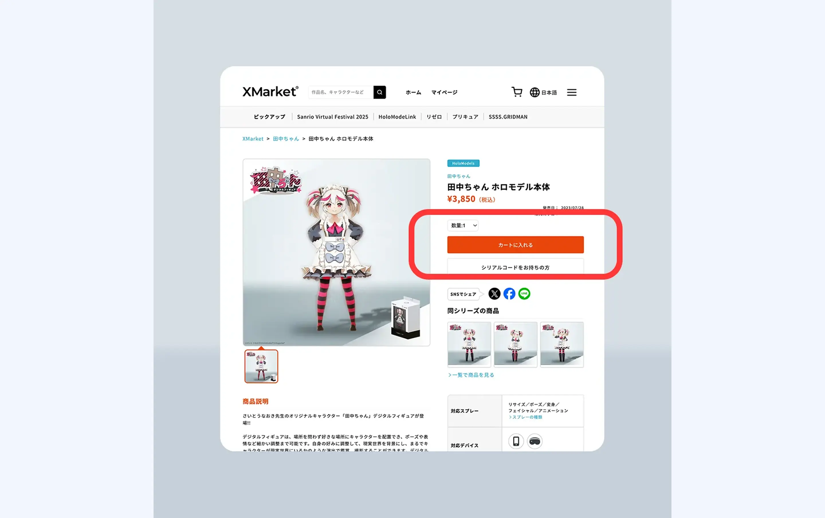 ①デジタルグッズECサイト、Xマーケットでホロモデリンク対応のデジタルフィギュアを購入します。購入にはアカウント(Uアカウント)登録が必要です。その後ホロモデルの商品ラインナップから「対応アプリ:HoloModeLink」にチェックを入れて絞り込んで購入します。