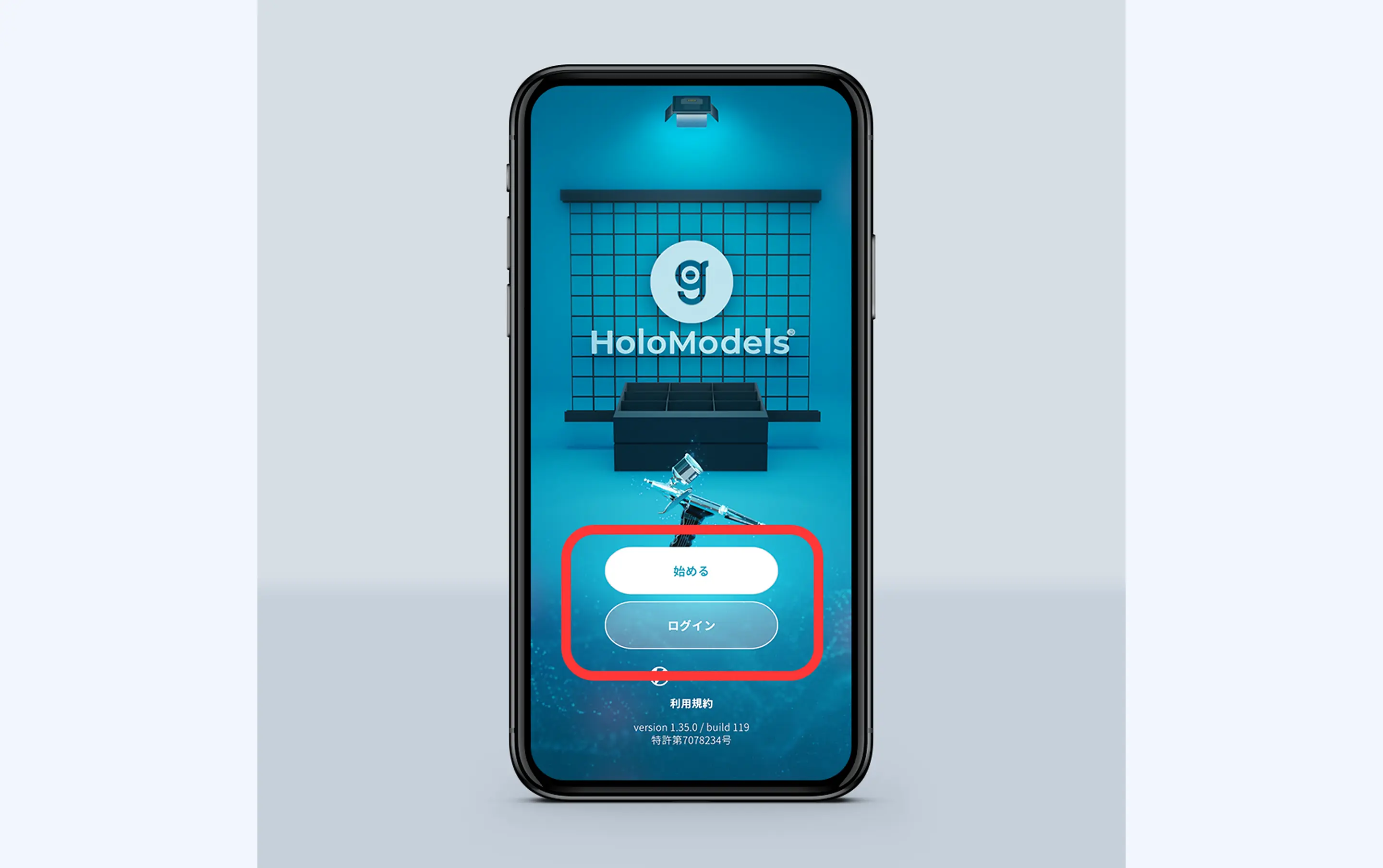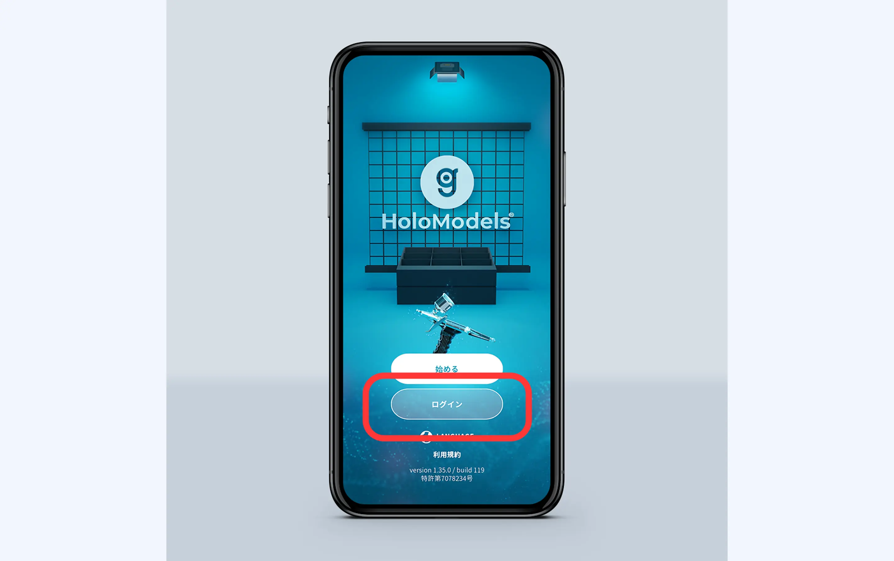 ①スマートフォンアプリ「ホロモデル(HoloModels)」を起動します。iOSの場合、アプリ起動時に「"HoloModels"がローカルネットワーク上のデバイスの検索および接続を求めています」というダイアログが出たら「許可」を押してください。ホロモデリンクに接続するために使用します。「ログイン」をしたあと「始める」をタップしてください。"HoloModels"がローカルネットワーク上のデバイスの検索および接続を求めています」というダイアログが出たら「許可」を押してください。ホロモデリンクに接続するために使用します。「ログイン」をしたあと「始める」をタップしてください。