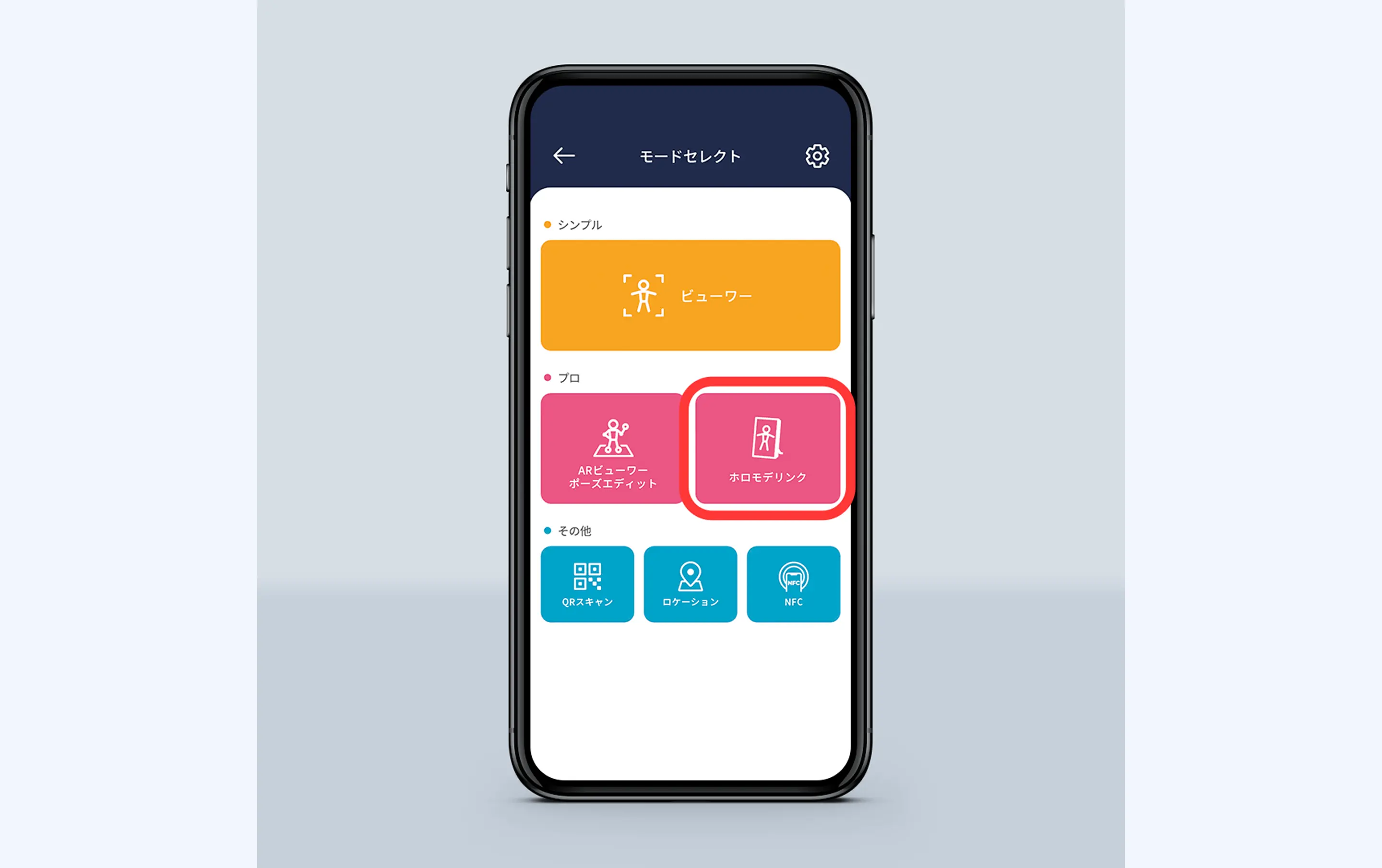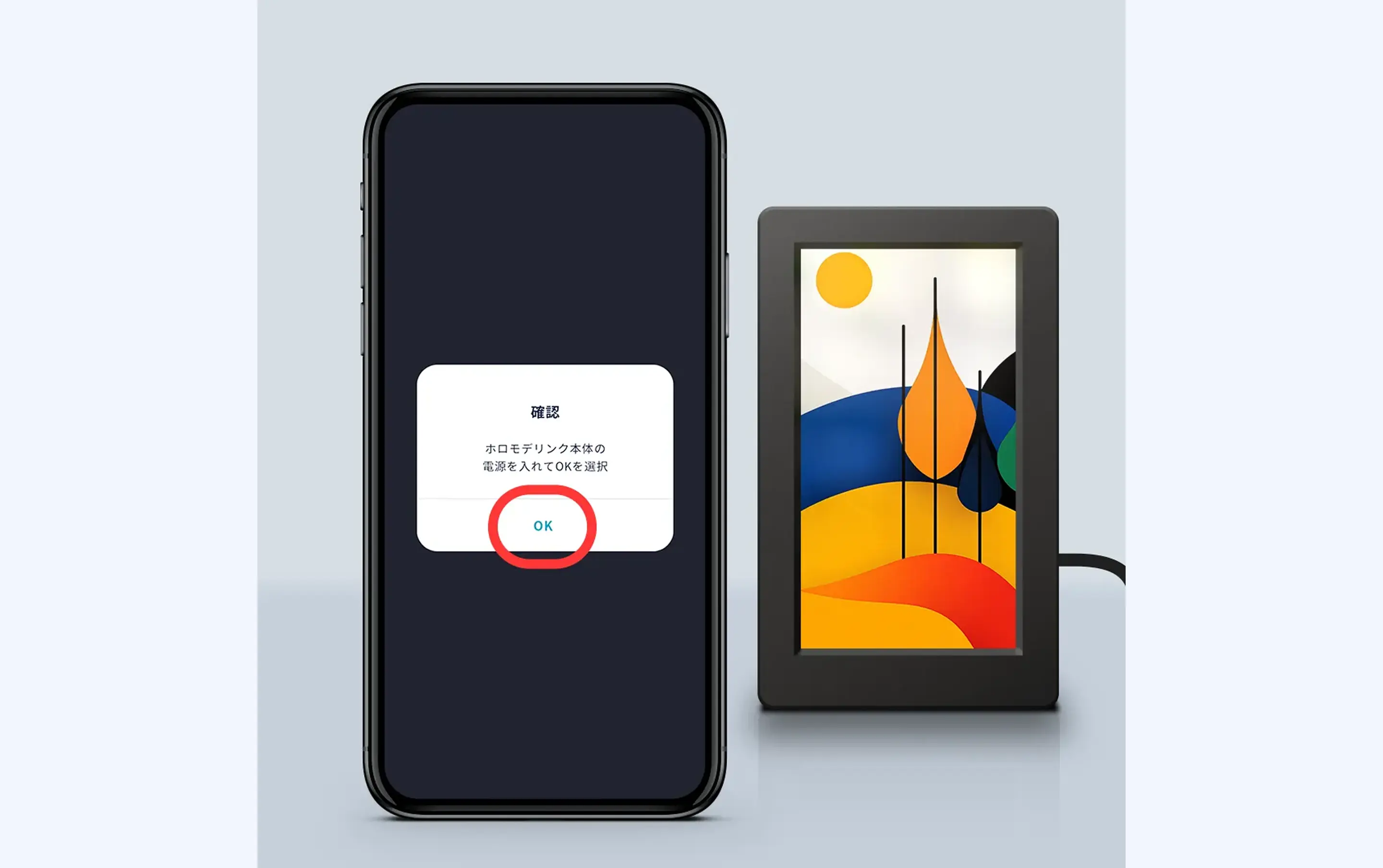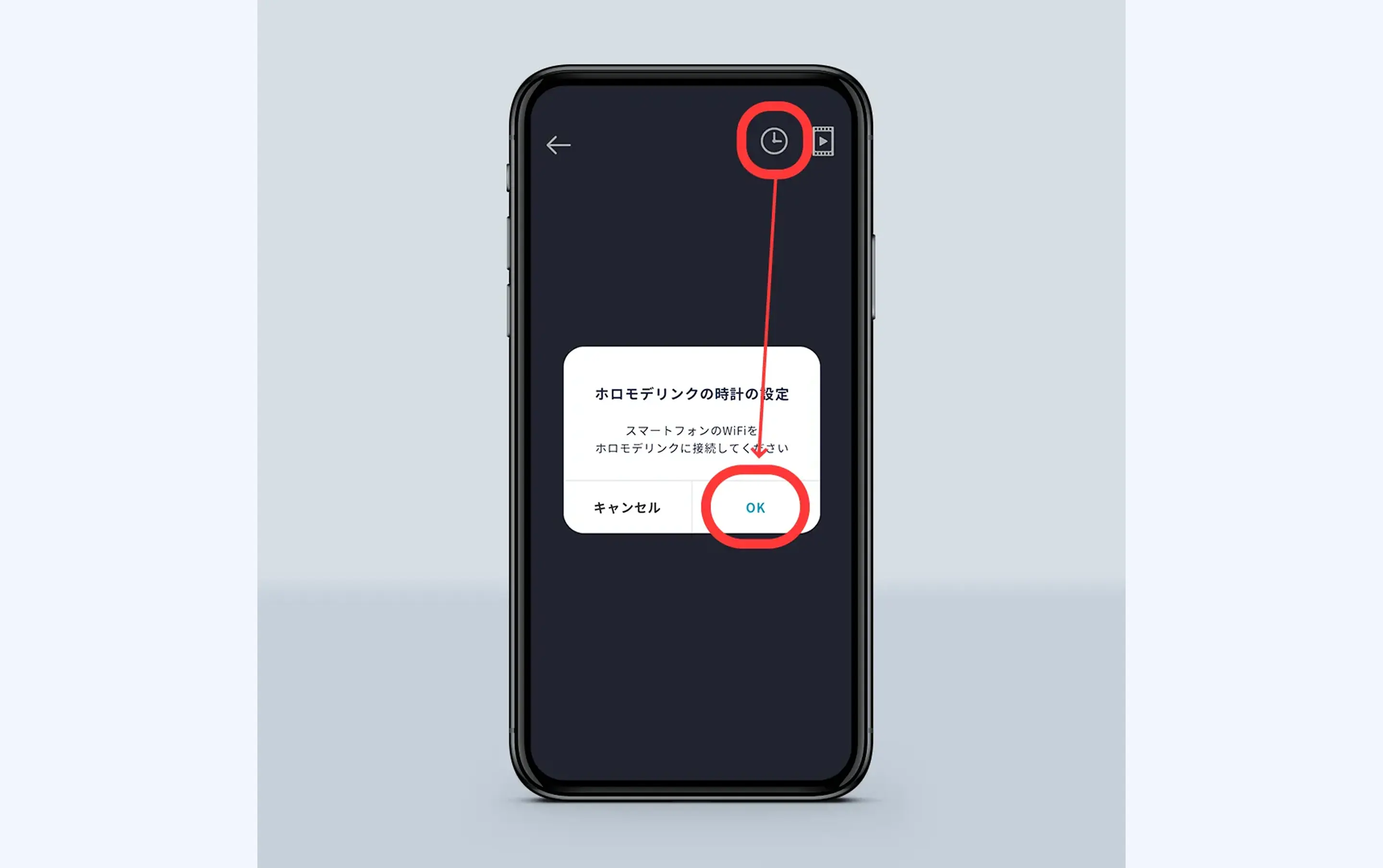 ①スマートフォンアプリ「ホロモデル(HoloModels)」を起動し、モードセレクトから「ホロモデリンク」を選択します。画面の案内に従ってホロモデリンクにACアダプタを差し込み起動したあと、「OK」を押してください。