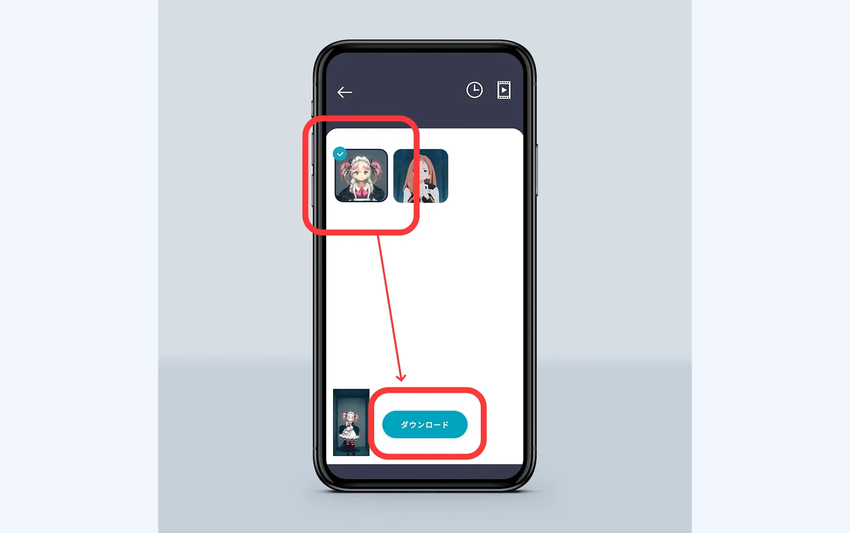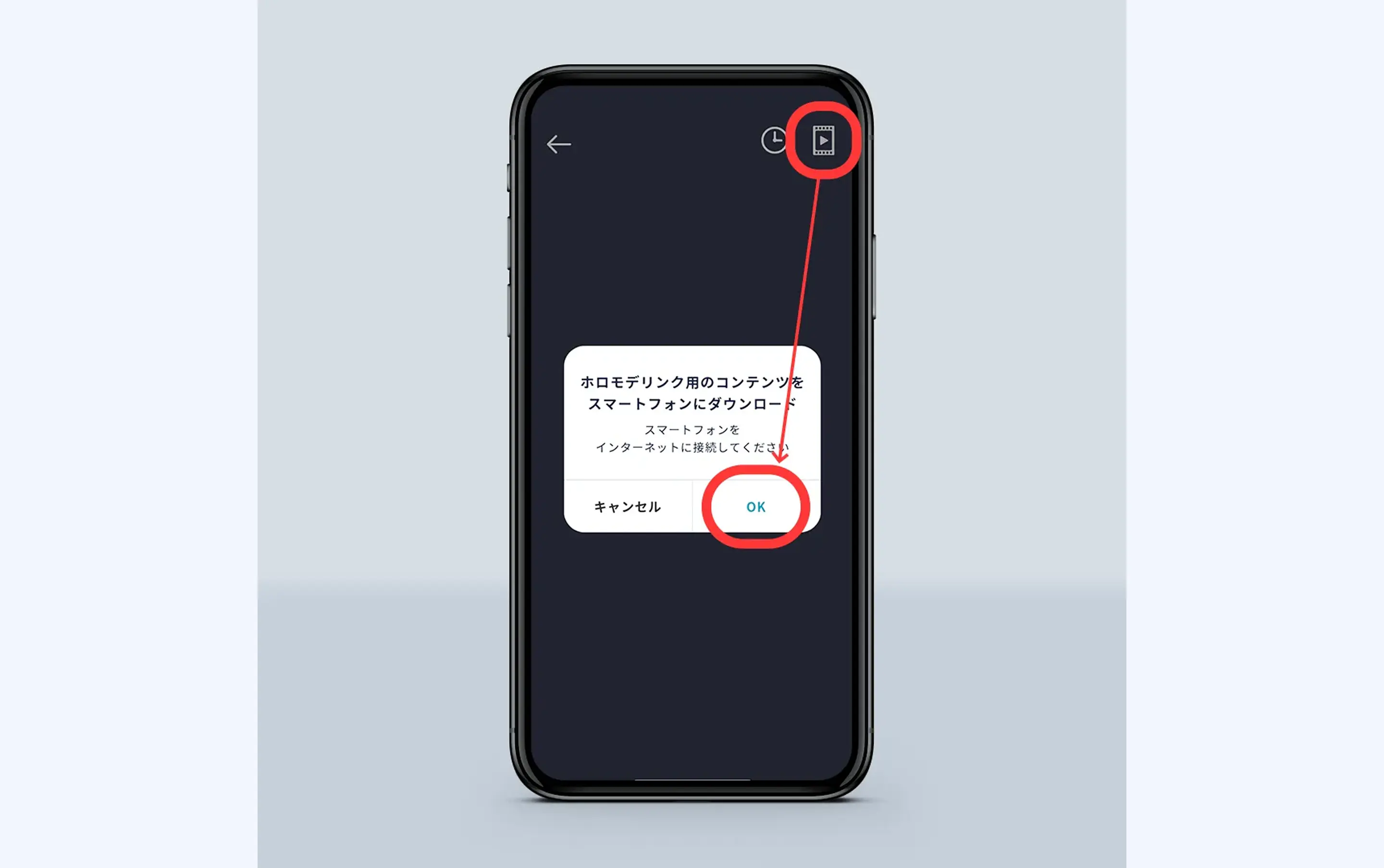 ③画面右上、動画のアイコンをタップしてホロモデリンク用のコンテンツを読み込みます。購入済みのホロモデルにホロモデリンク対応商品が含まれている場合、表示可能なコンテンツが一覧でリストアップされます。ホロモデリンクに表示したいコンテンツを選択して「ダウンロード」をタップしてください。