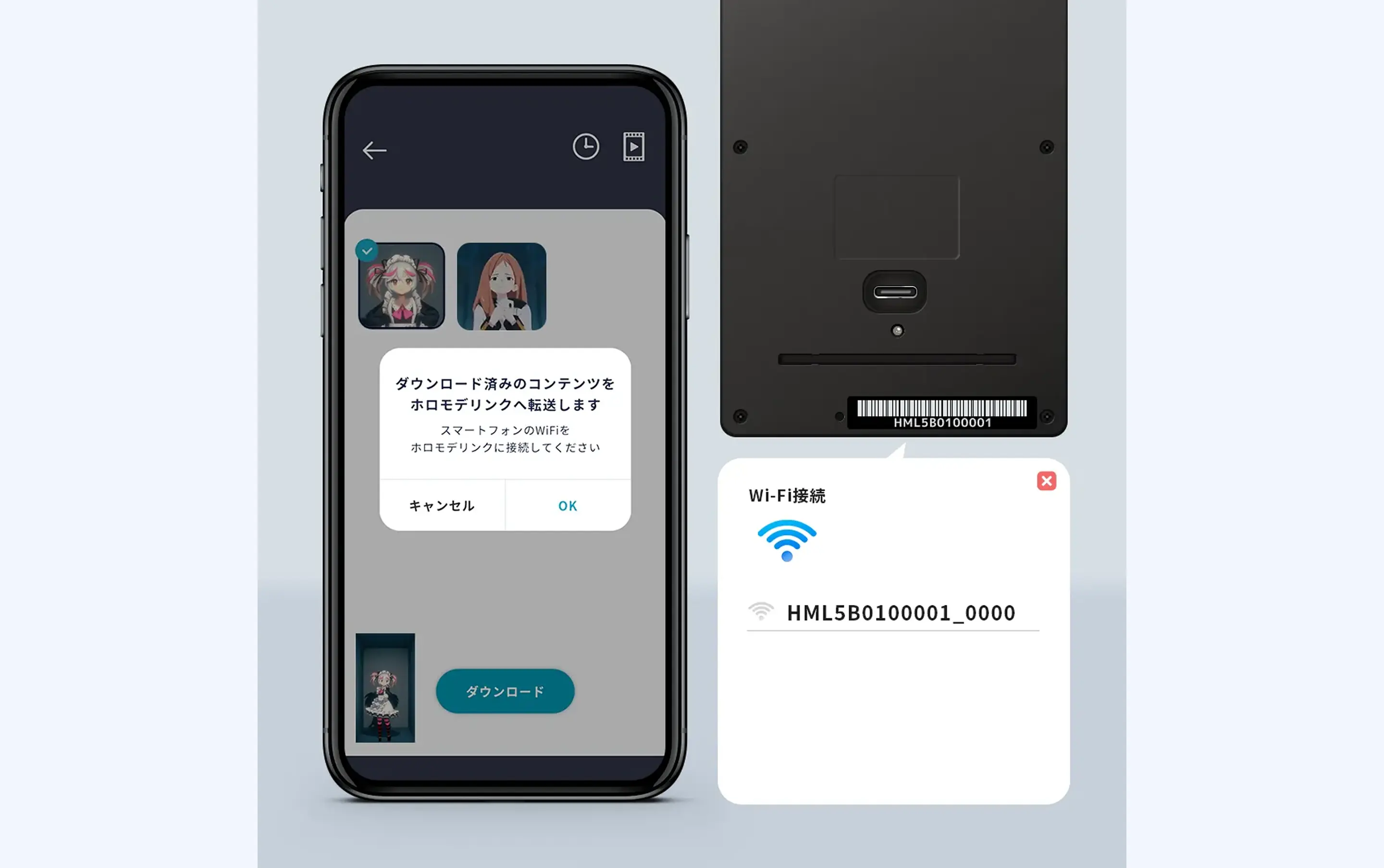 ④ダウンロードが完了したらホロモデリンクのWi-Fiに接続してコンテンツを転送します。ホロモデリンクのWi-Fiは本体裏面、HMLで始まる文字列が先頭に付いたネットワーク名で表示されます。接続できたら「転送」ボタンをタップしてコンテンツを転送します。