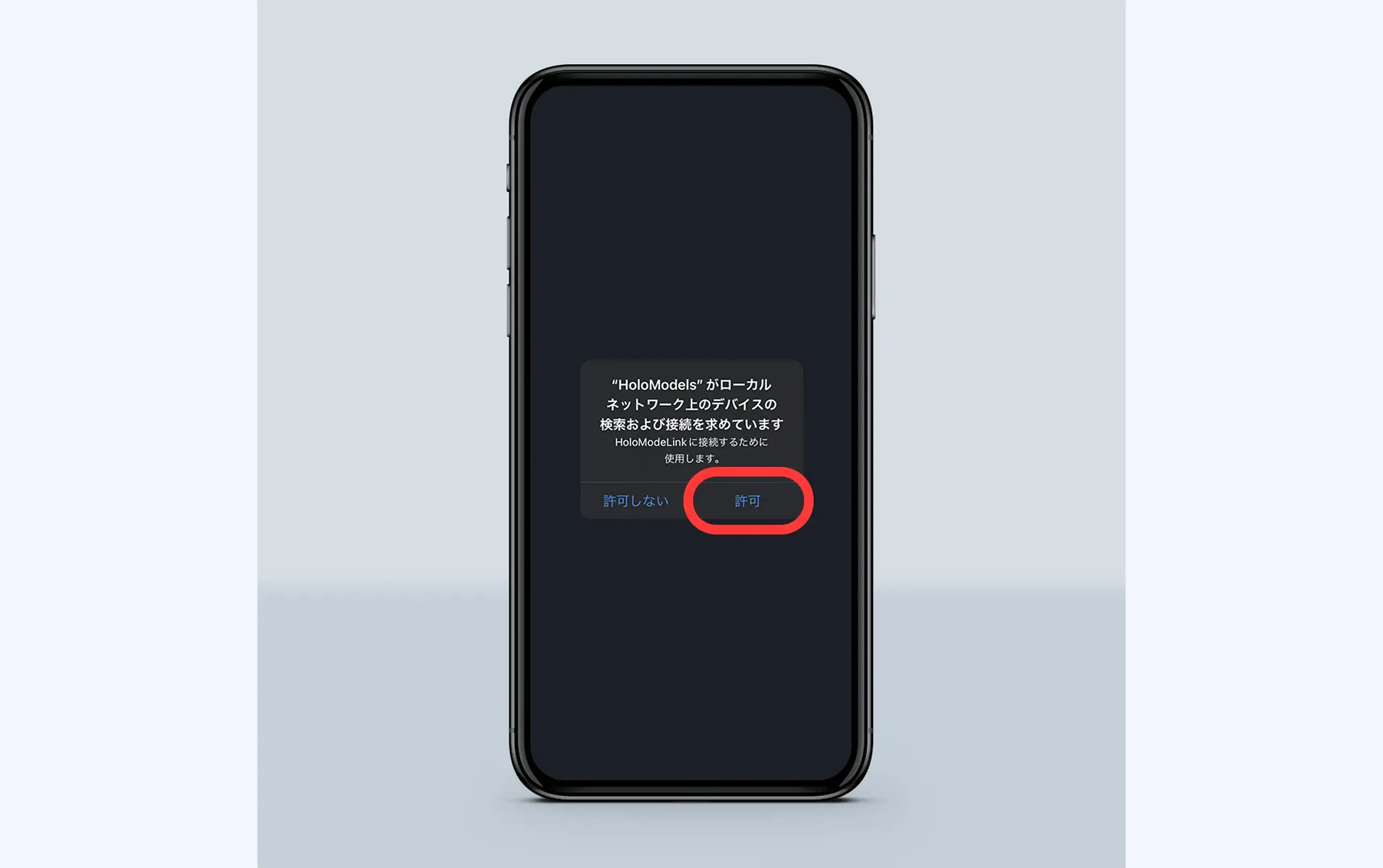 ②スマートフォンアプリ「ホロモデル(HoloModels)」をインストールします。iOSの場合、アプリ起動時に「"HoloModels"がローカルネットワーク上のデバイスの検索および接続を求めています」というダイアログが出たら「許可」を押してください。ホロモデリンクに接続するために使用します。ホーム画面から「ログイン」を選択してフィギュアを購入した「Uアカウント」でログインしてください。ホロモデルアプリで購入したフィギュアを使用することができます。