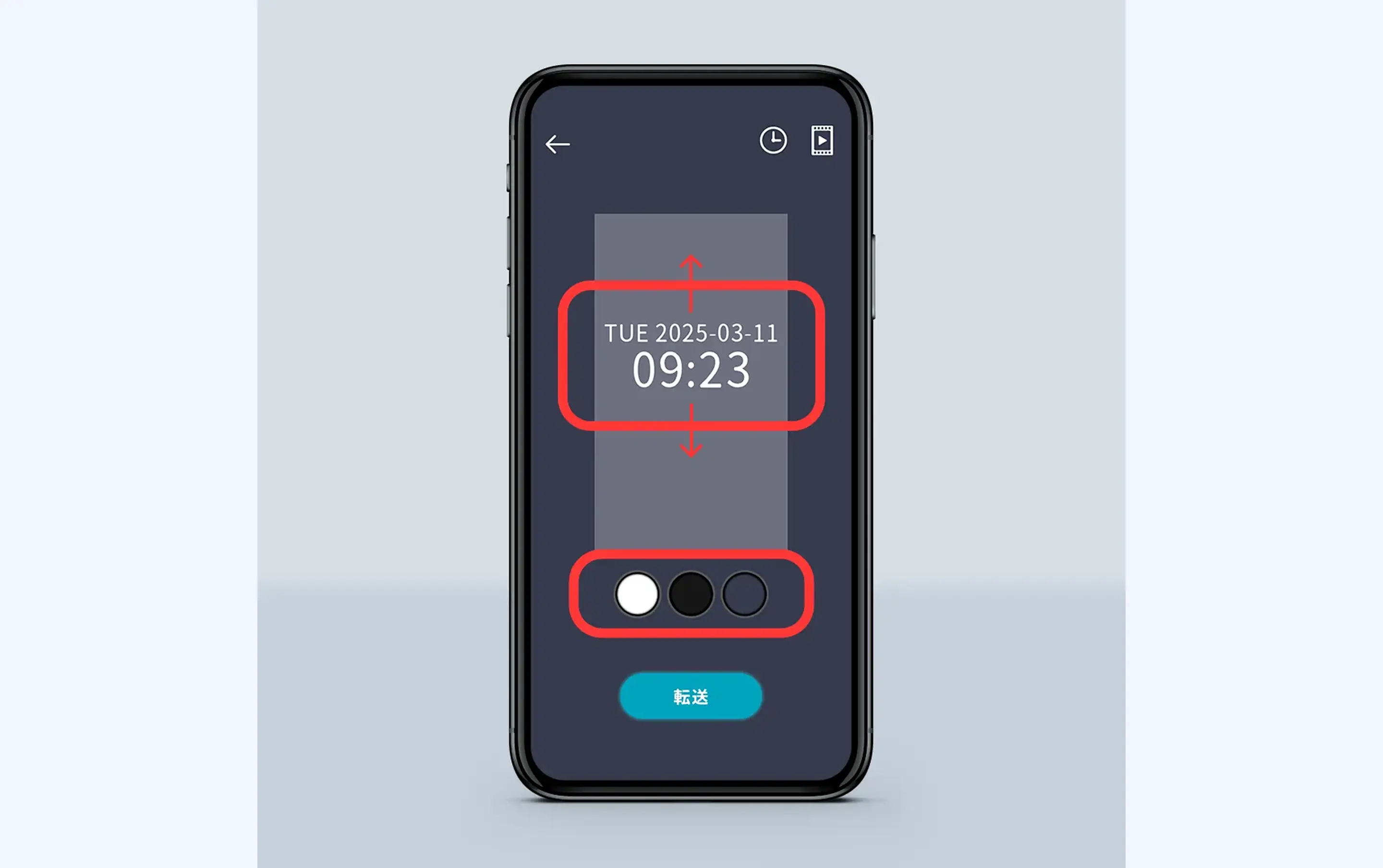 ③画面右上、時計のアイコンをタップして表示する時計の設定に移ります。上下の表示位置設定と文字色【白、黒、透明(表示無し)】を選んでください。