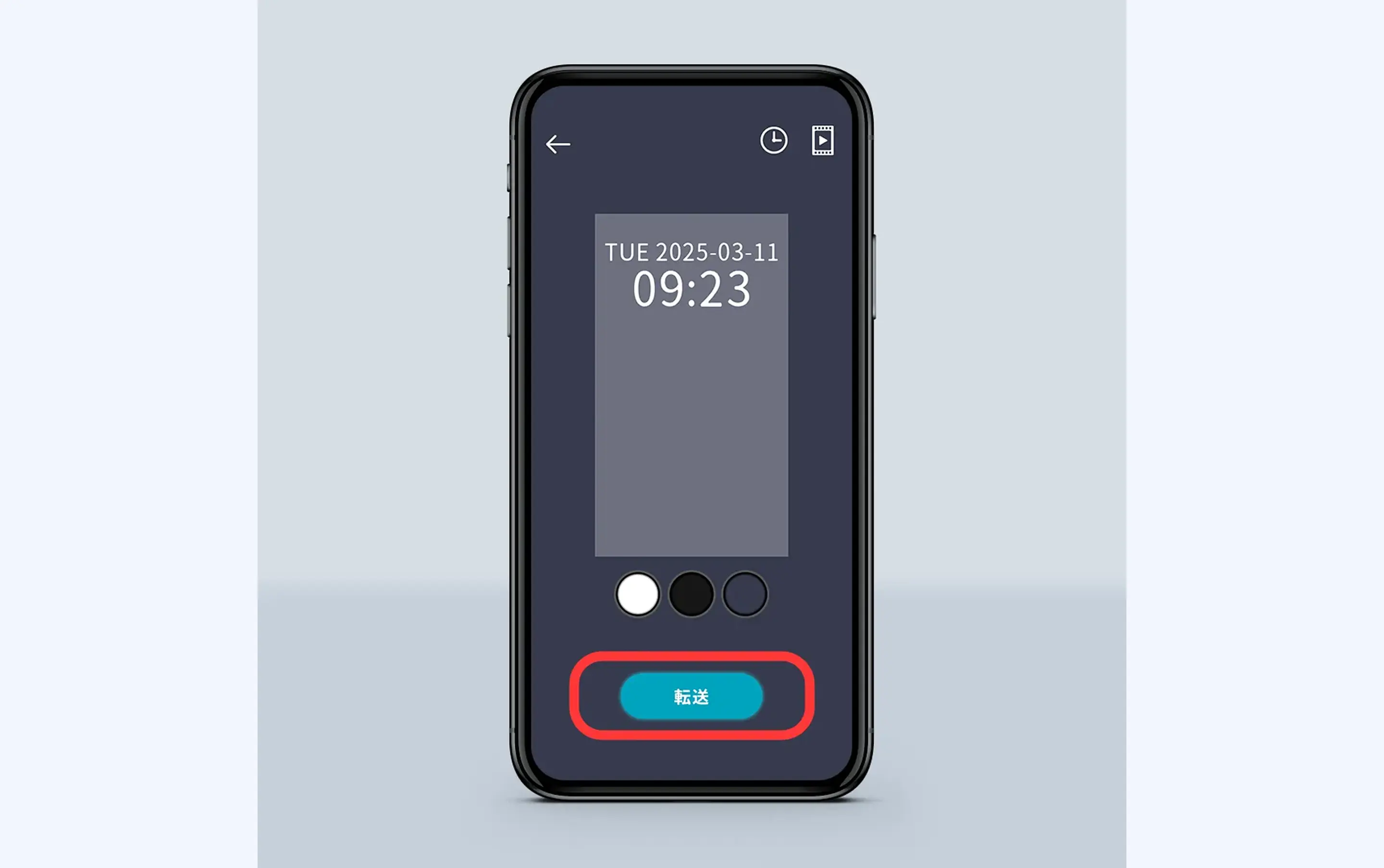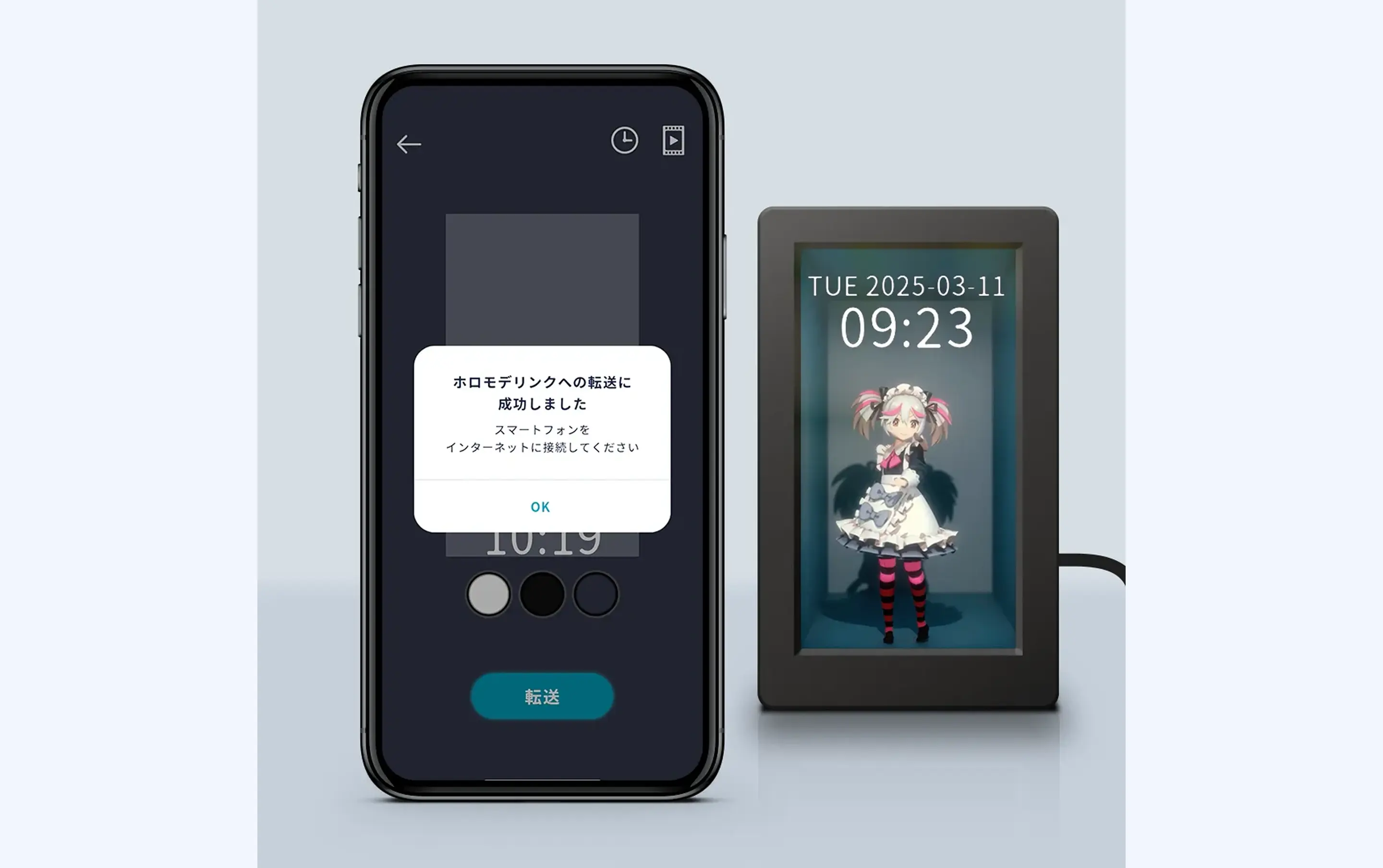 ④位置と色を選んだら「転送」ボタンをタップします。成功ダイアログが表示されたら完了です。ホロモデリンクに時計が表示されます。