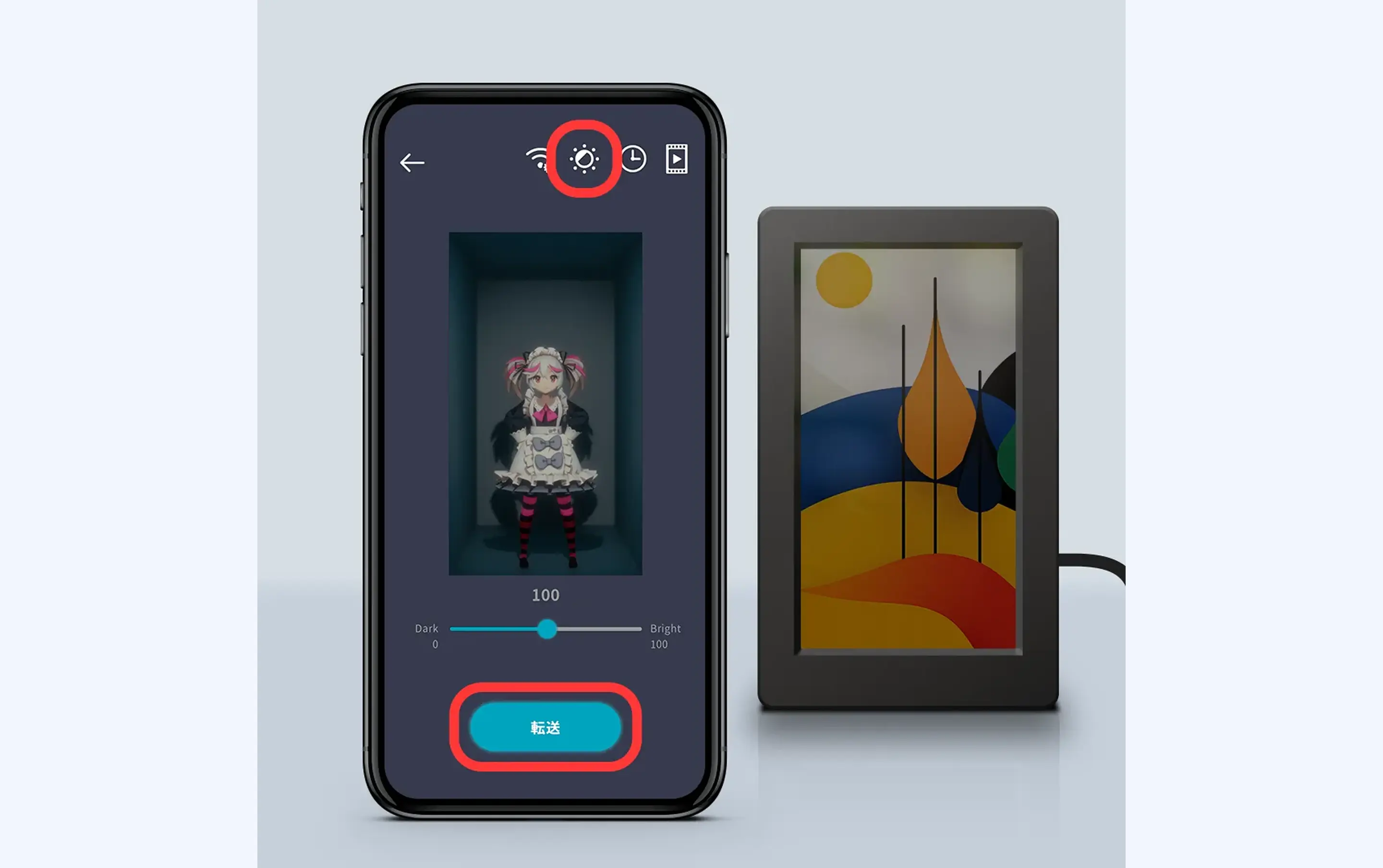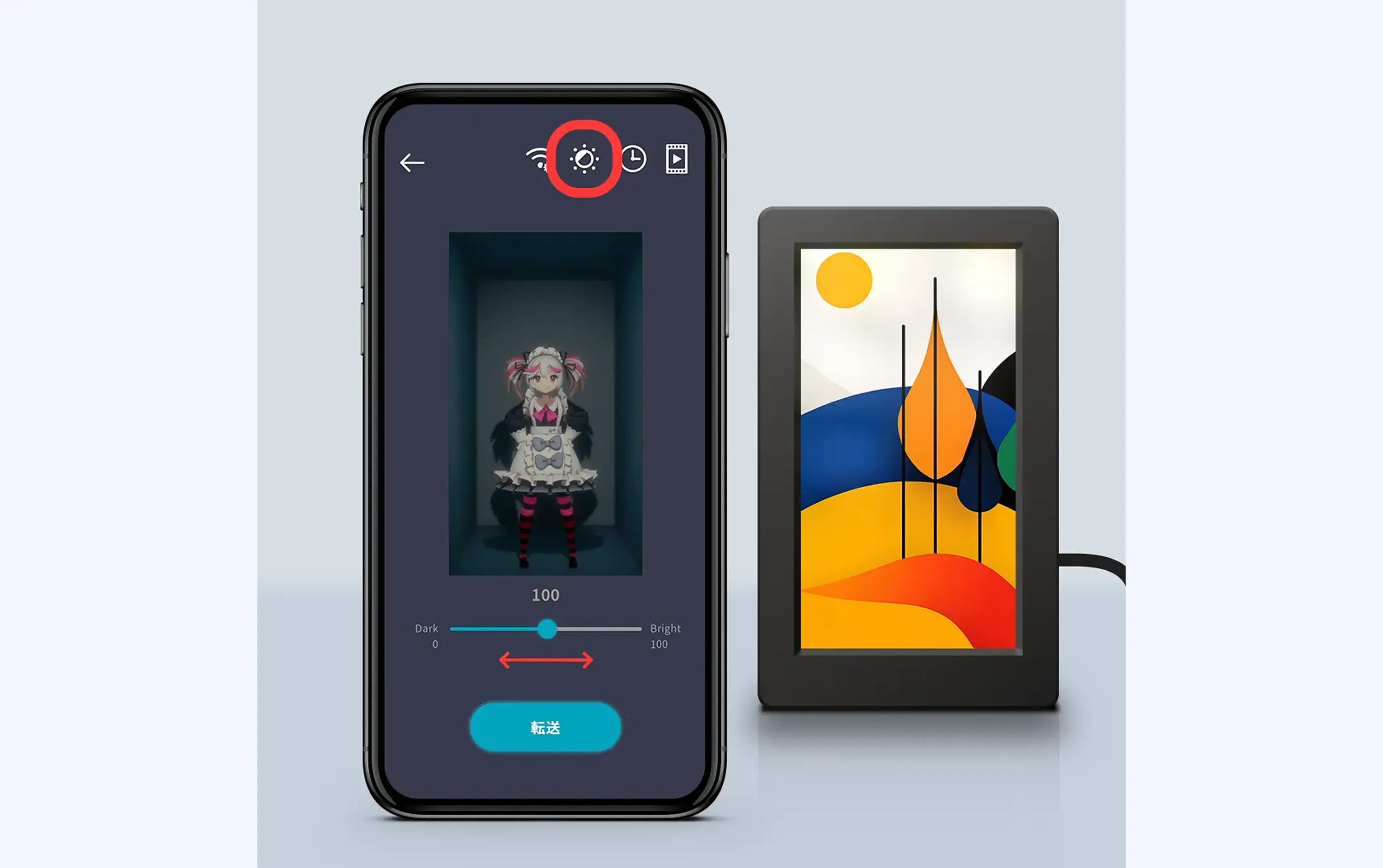 ②画面右上の光のマークをタップして輝度の変更に入ります。画面下のバーを左右に調整してサンプル画面を見ながらお好みの輝度に設定してください。ホロモデリンクとWi-Fiで繋いで転送ボタンを押すとデバイスに反映されます。