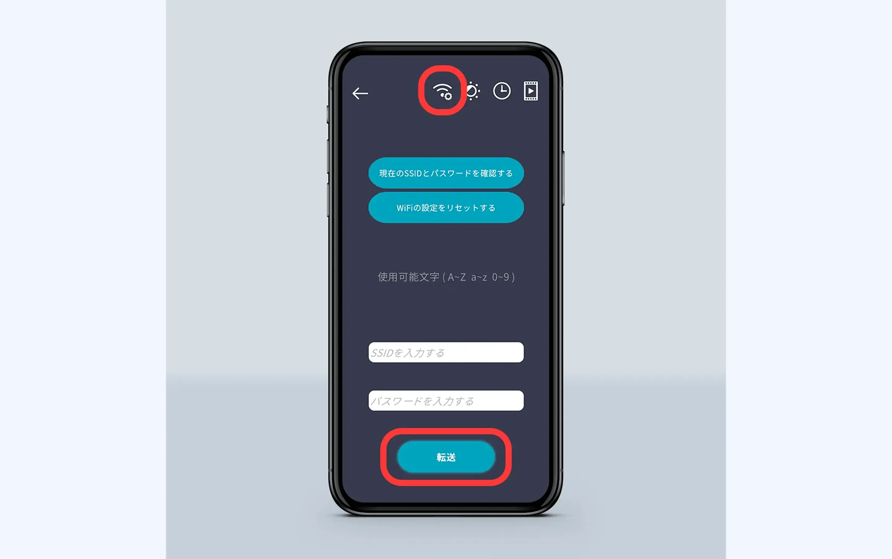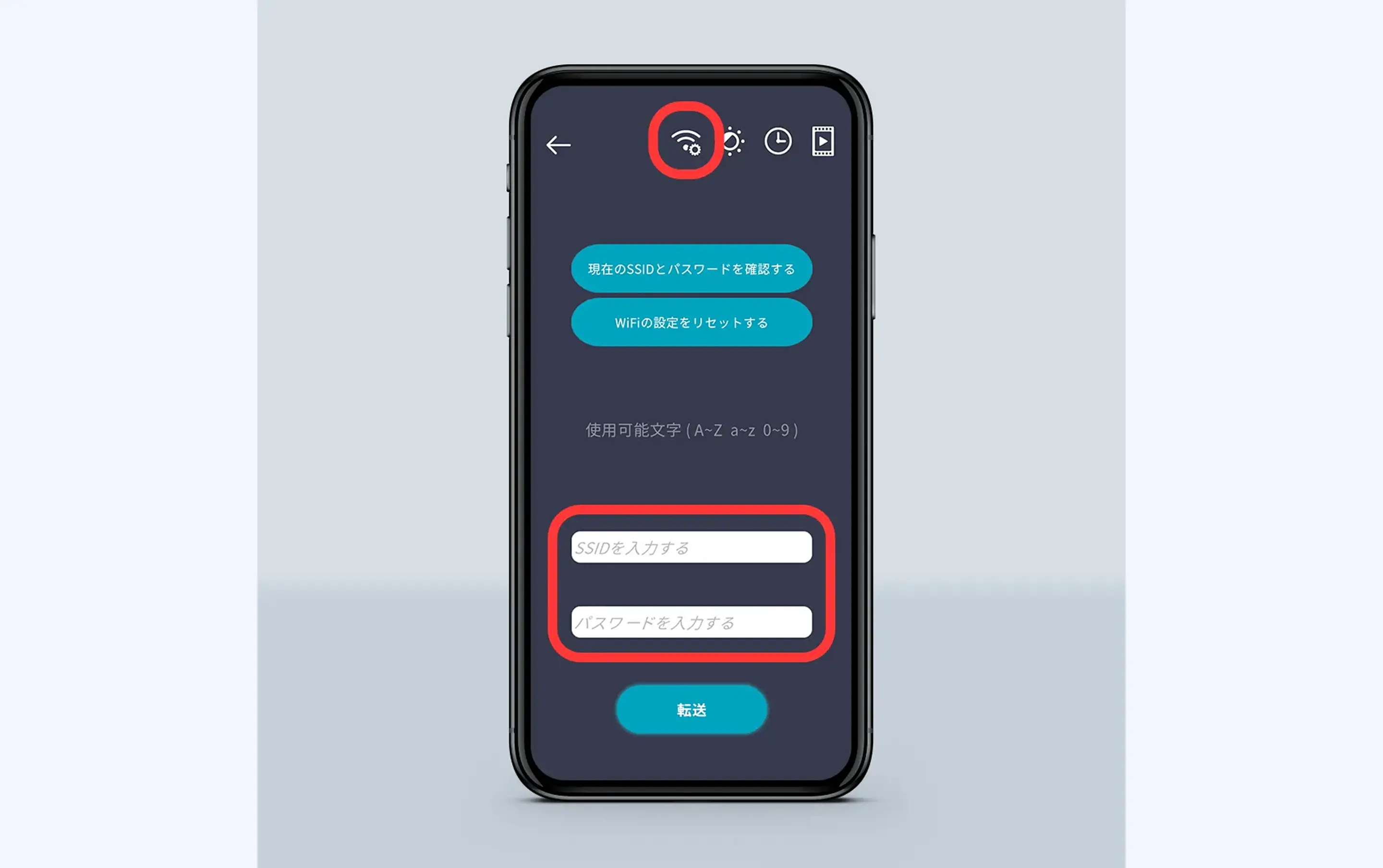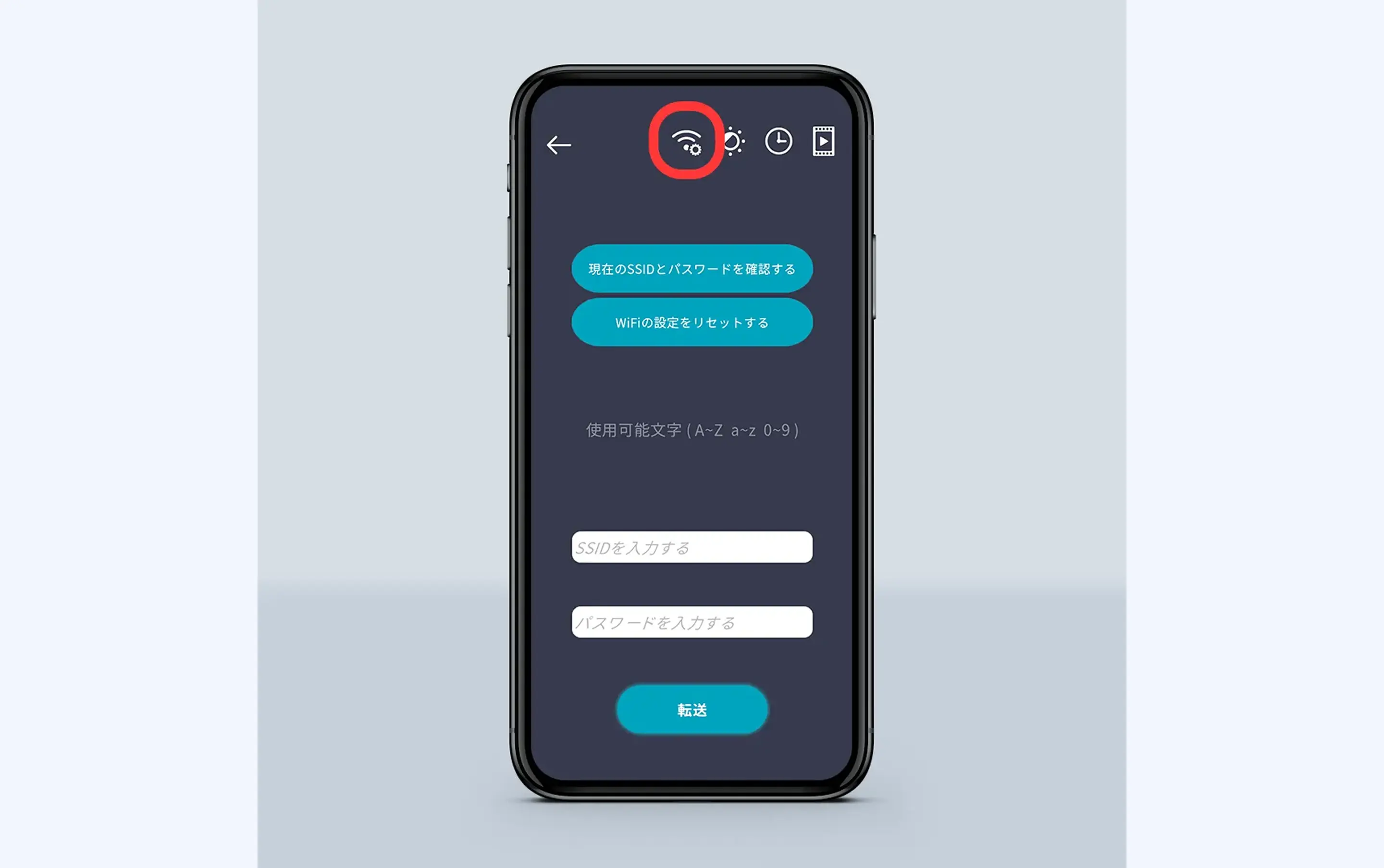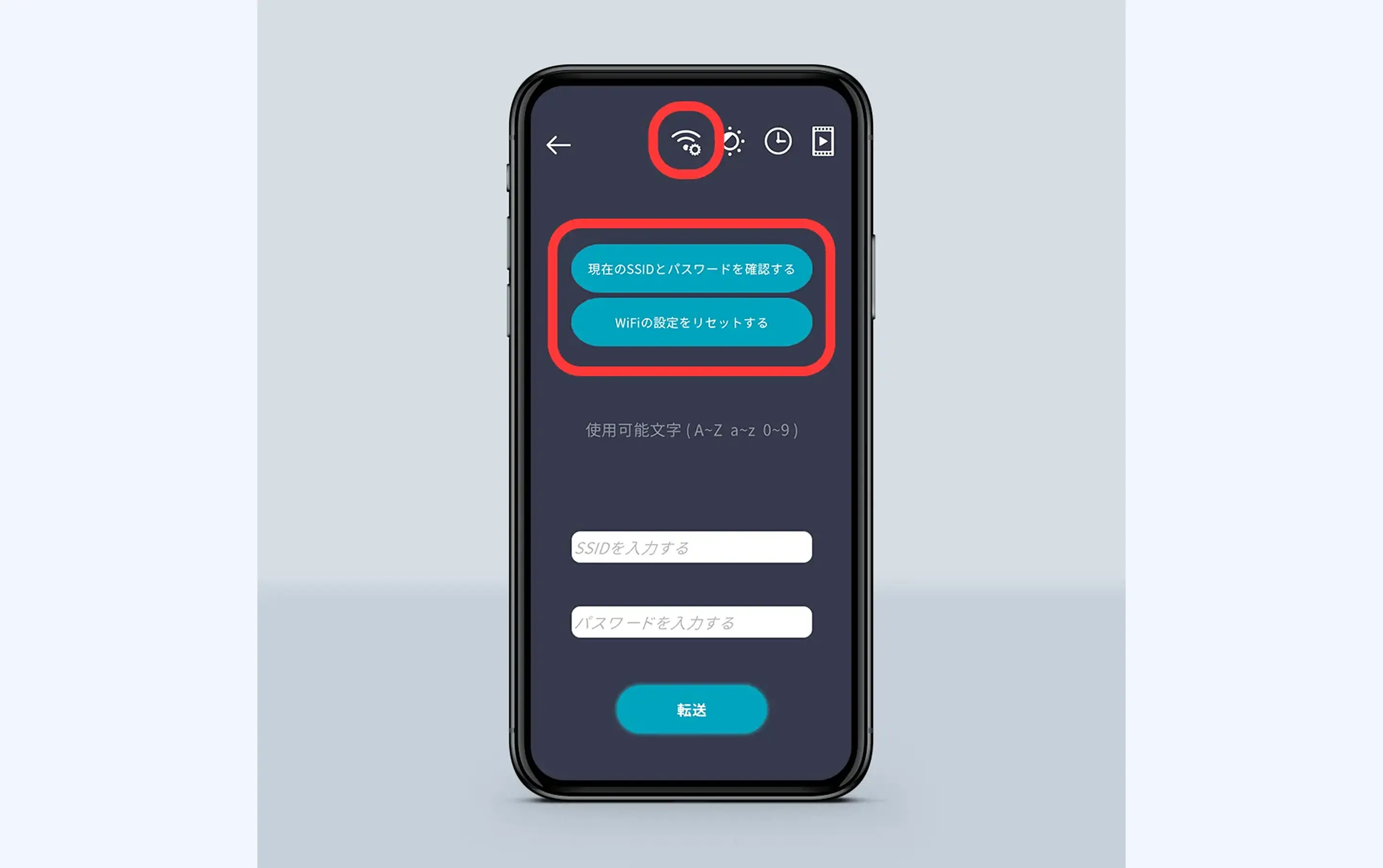 ②画面右上の電波のマークをタップしてWi-Fiの設定に入ります。画面下、「SSIDを入力する」に任意のID、「パスワードを入力する」に任意のパスワードを設定することができます。