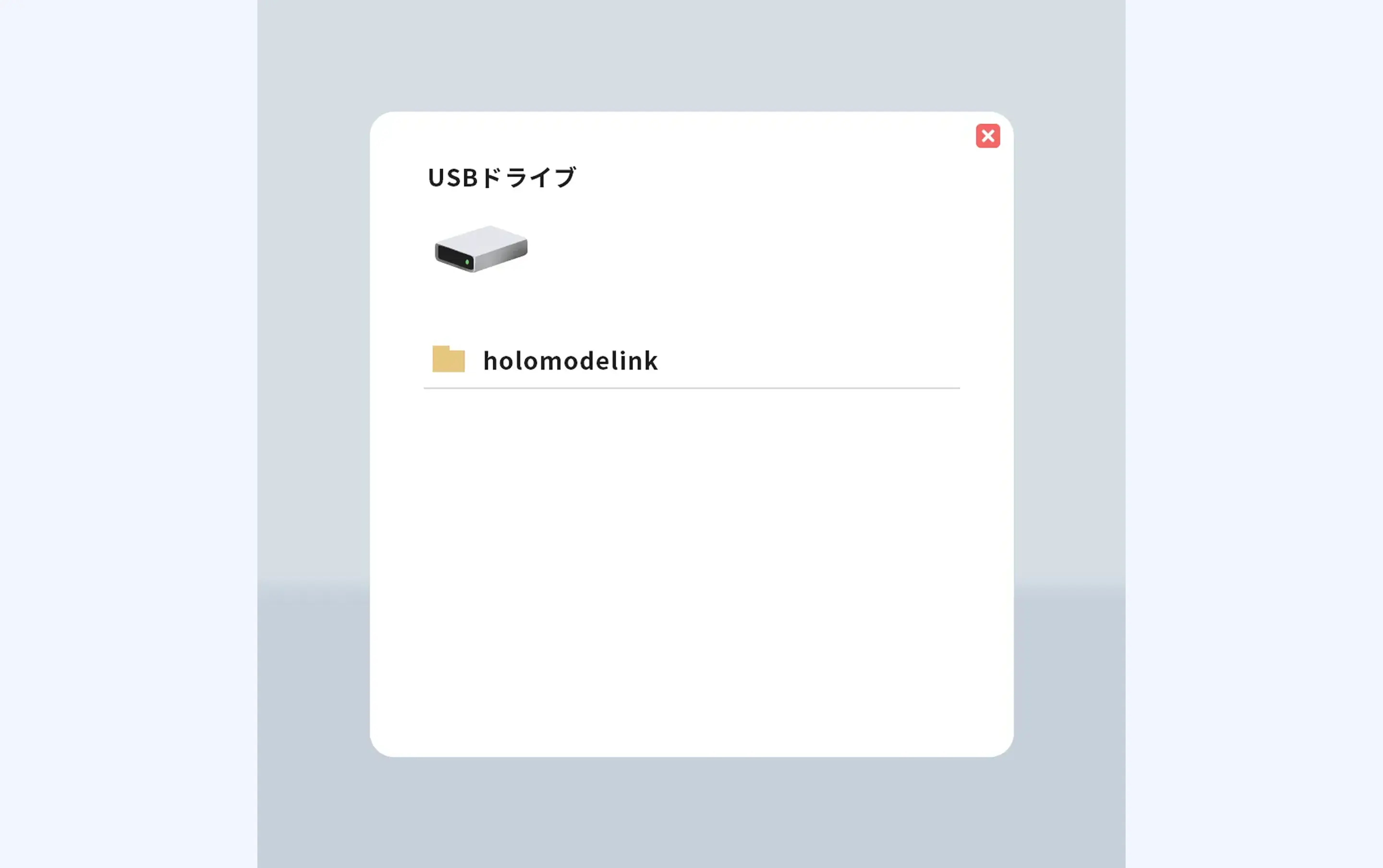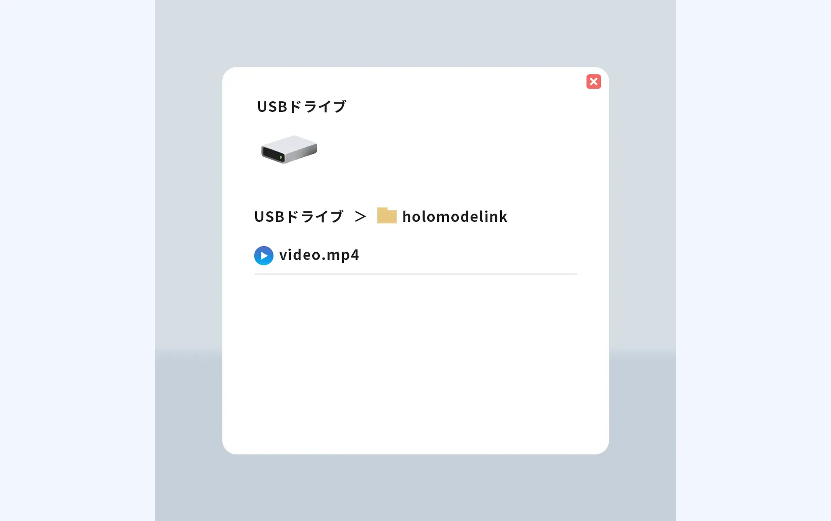 ①お手持ちのUSBメモリに「holomodelink」と命名したフォルダを作成し、フォルダ内に作成した動画に半角英数字で名前を付けて保存します。複数ファイルには対応できませんので、必ず「holomodelink」フォルダ内に動画ファイルが1つある状態にしてください。