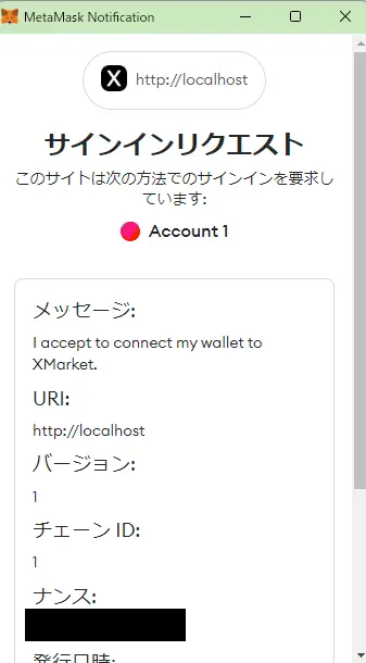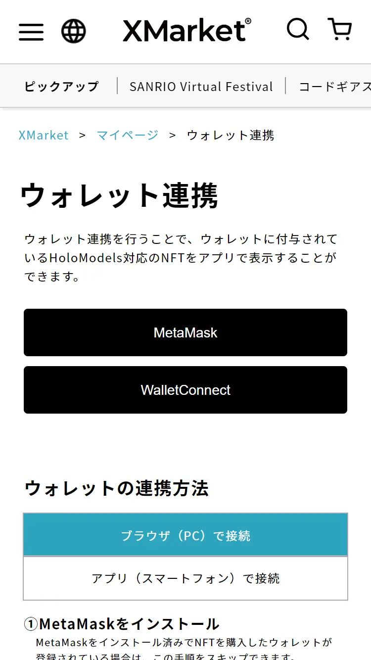 Xマーケットのウォレット連携ページ(このページ)で「MetaMask」ボタンをクリックします。