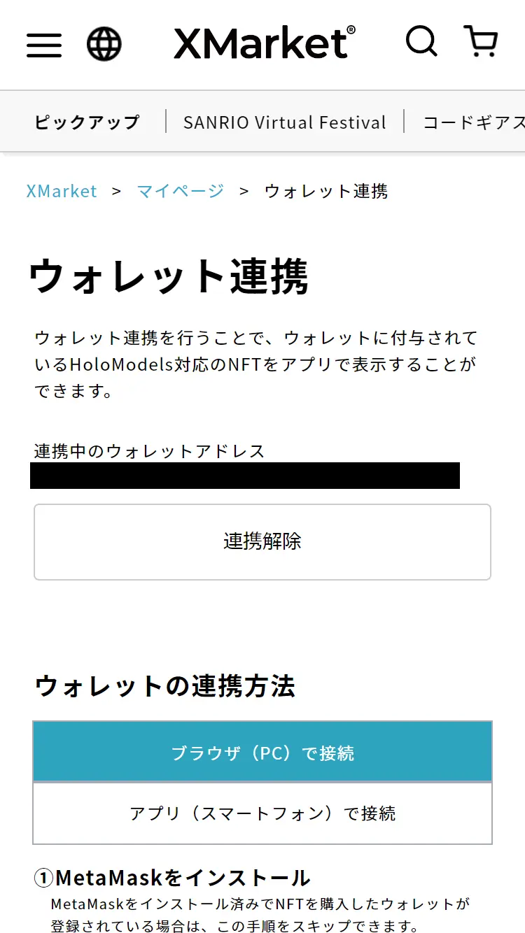 正しく連携されると、Xマーケットに連携中のウォレットアドレスが表示されます。